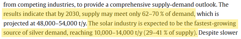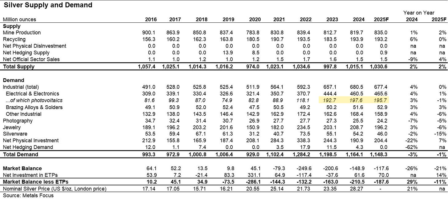 L’immagine sottostante mostra domanda e offerta industriale di argento e come puoi vedere, a partire dal 2020 è iniziato un massiccio squilibrio tra le due (vedi dati evidenziati).