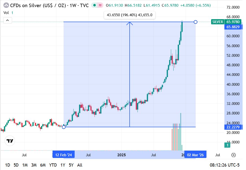 Dal minimo del 2024 a $22,07 l’oncia, l’argento è salito del 196%. Feci un video in quel periodo, un video col senno di poi, direi invecchiato bene (puoi vederlo qui).