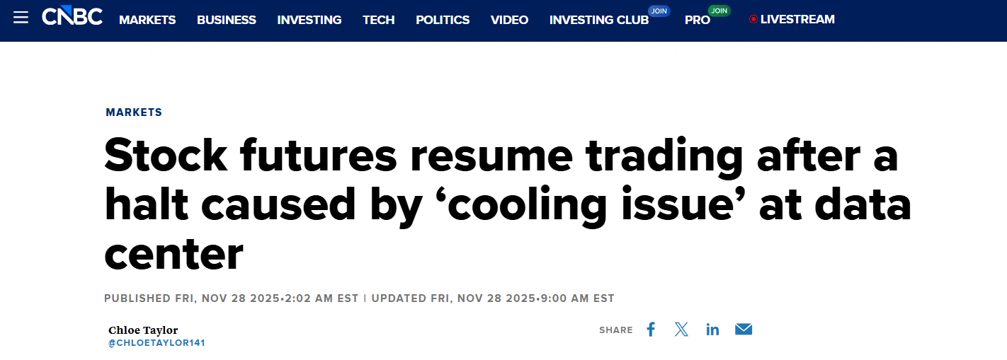La sospensione è durata da giovedì sera fino alla riapertura dei mercati di venerdì mattina alle 8:30 e la causa confermata è stata proprio di un “problema” ai sistemi di raffreddamento.
